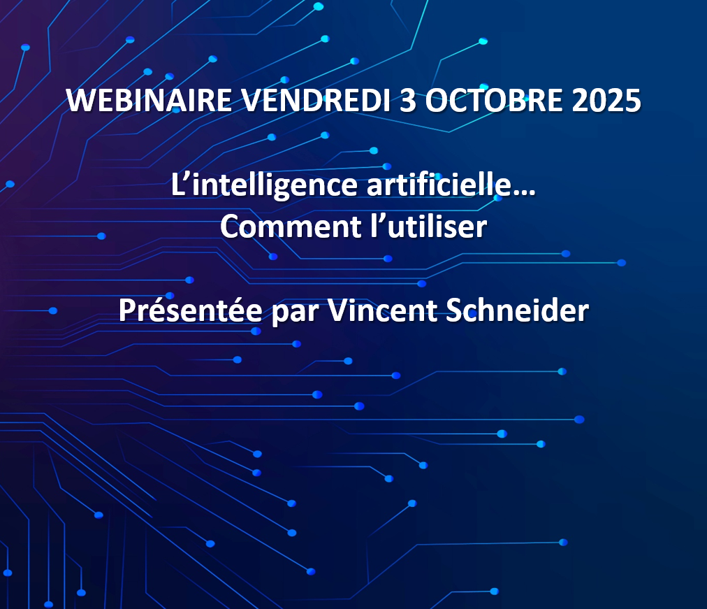 09Oct9 octobre 2025 L’Intelligence Artificielle… Comment l’utiliser par Vincent Schneider Jacques Theuriot2025-10-09T10:55:49+02:00 Par Jacques Theuriot Nos conférences et webinaires Webinaire du 3 Octobre 2025 L’Intelligence Artificielle… Comment l’utiliser par Vincent Schneider Auteur Jacques Theuriot