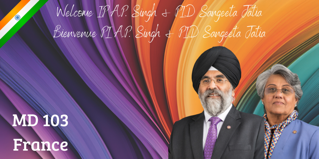 Le District Multiple 103 aura l’honneur de recevoir le Président international A.P. Singh, accompagné de PID Sangeeta Jatia, du 18 au 20 février 2026.